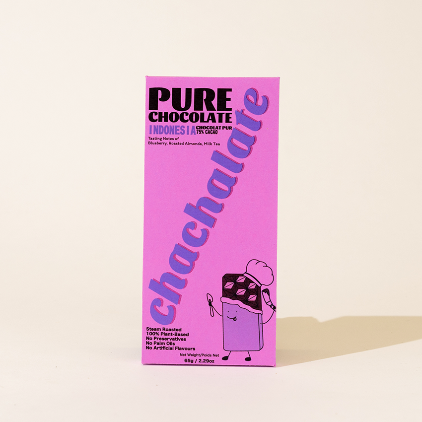 Meet Chachalate's Indonesia Pure 75%. This is a delicious chocolate from Indonesia, Ransiki. In the 1950s, the Ransiki Central Fermentary in West Papua was a bustling cacao hub — and now, it’s back and better than ever. Revived in 2017, this community-led project is restoring nearly 1,000 hectares of land and bringing new life to the region’s cacao. The result? Beans that are as meaningful as they are delicious — a reflection of West Papua’s rich soil, sustainable farming, and renewed local pride. You'll taste notes of blueberry, roasted almonds and milk tea!