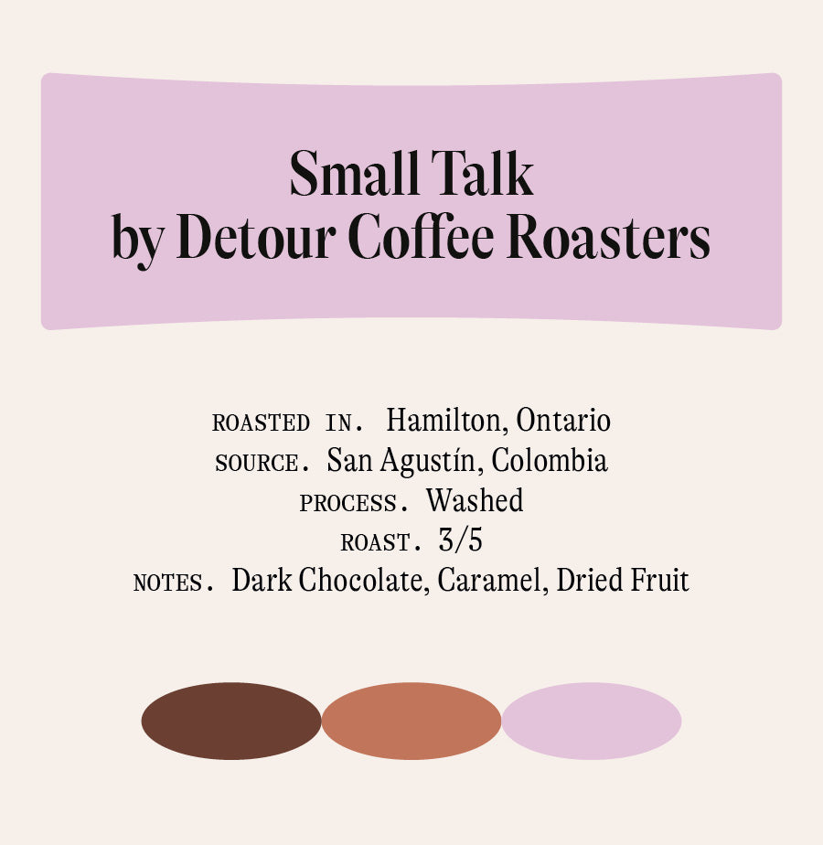 "Small Talk boasts layered acidity and sweetness, with fruity notes of ripe strawberries, raspberry coulis, green melon, and freshly pressed orange juice meshed together to form a bright cocktail of complex flavours." — Ryan McCabe, Co-Director of Coffee at Detour Coffee Roasters