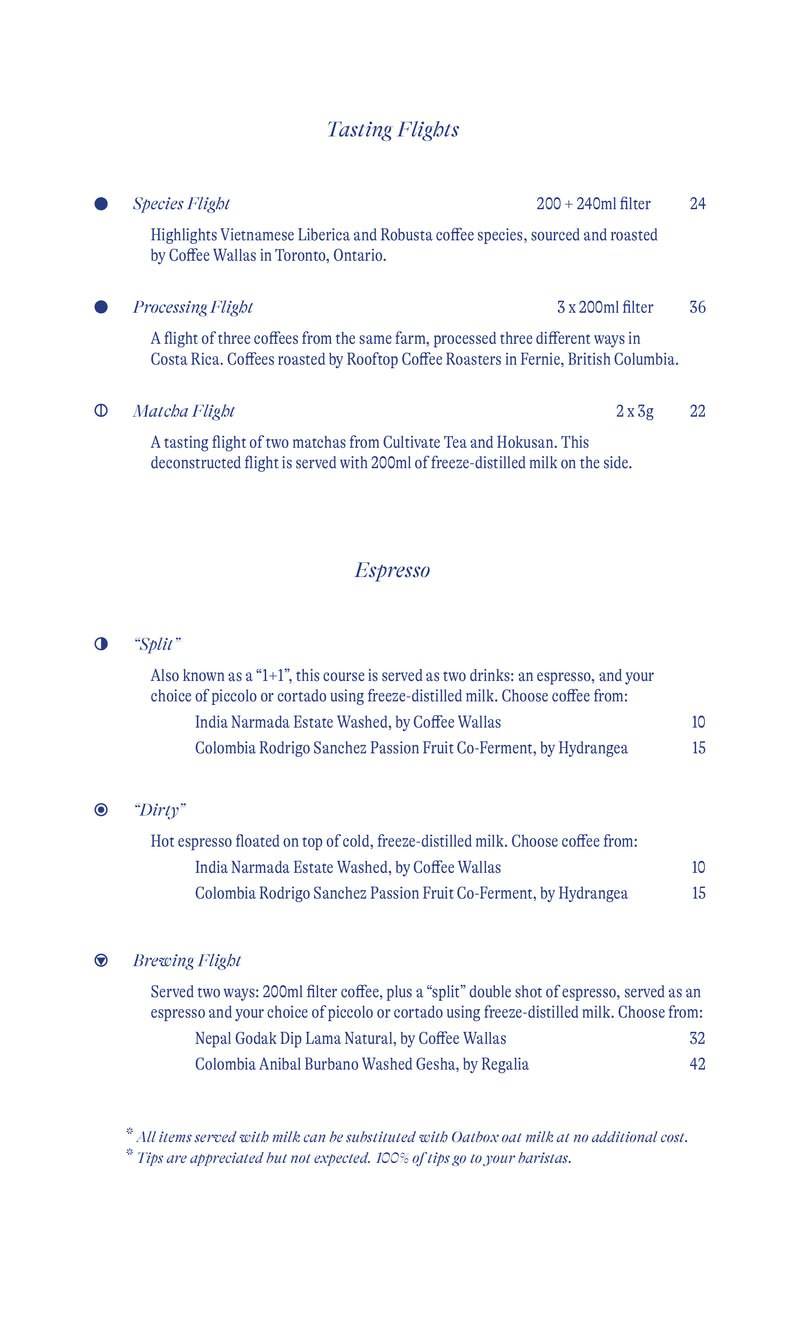 We offer a curated selection including coffee flights, matcha flights, rare and competition coffees, and a limited menu of espresso-based beverages. Our menu is designed to showcase exceptional coffees in a thoughtful, intentional way.
