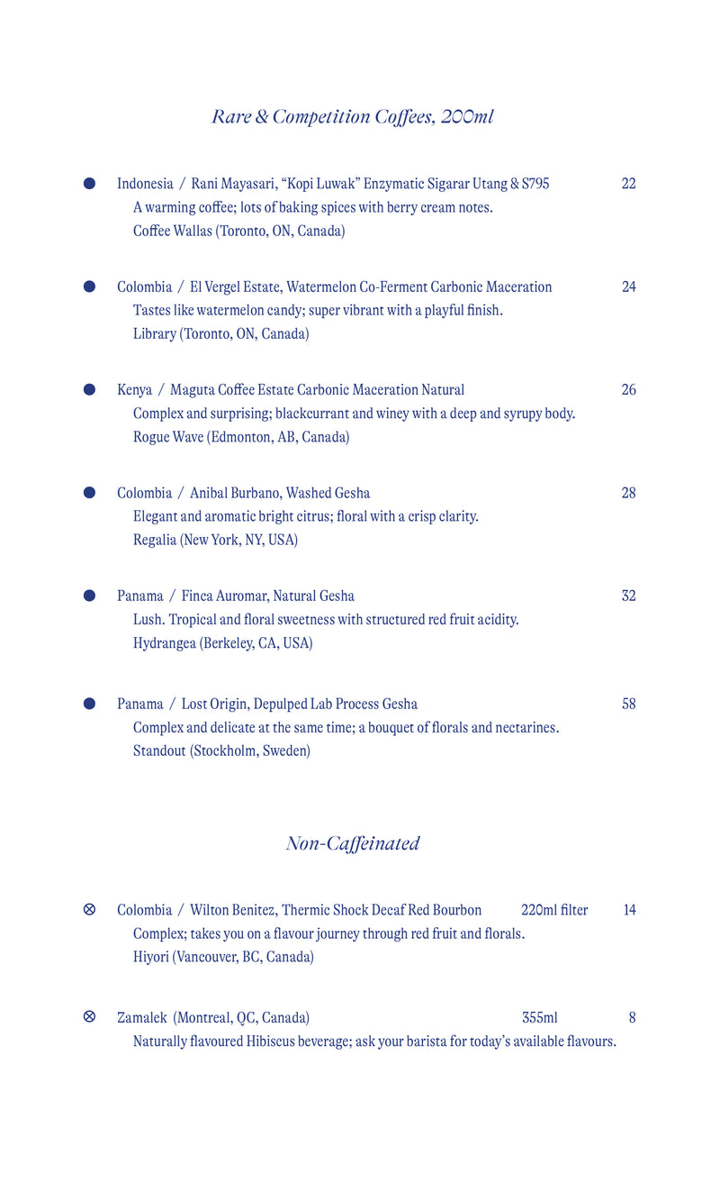 Menu subject to change based on seasonality and coffee availability.